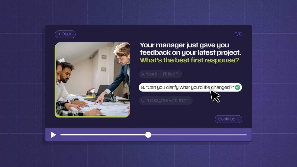 Branching scenarios provide a choose-your-own-path learning approach with videos structured into short, highly specific snippets. Instead of a static video playlist, learners can watch videos in an order that will best support their learning or company role.